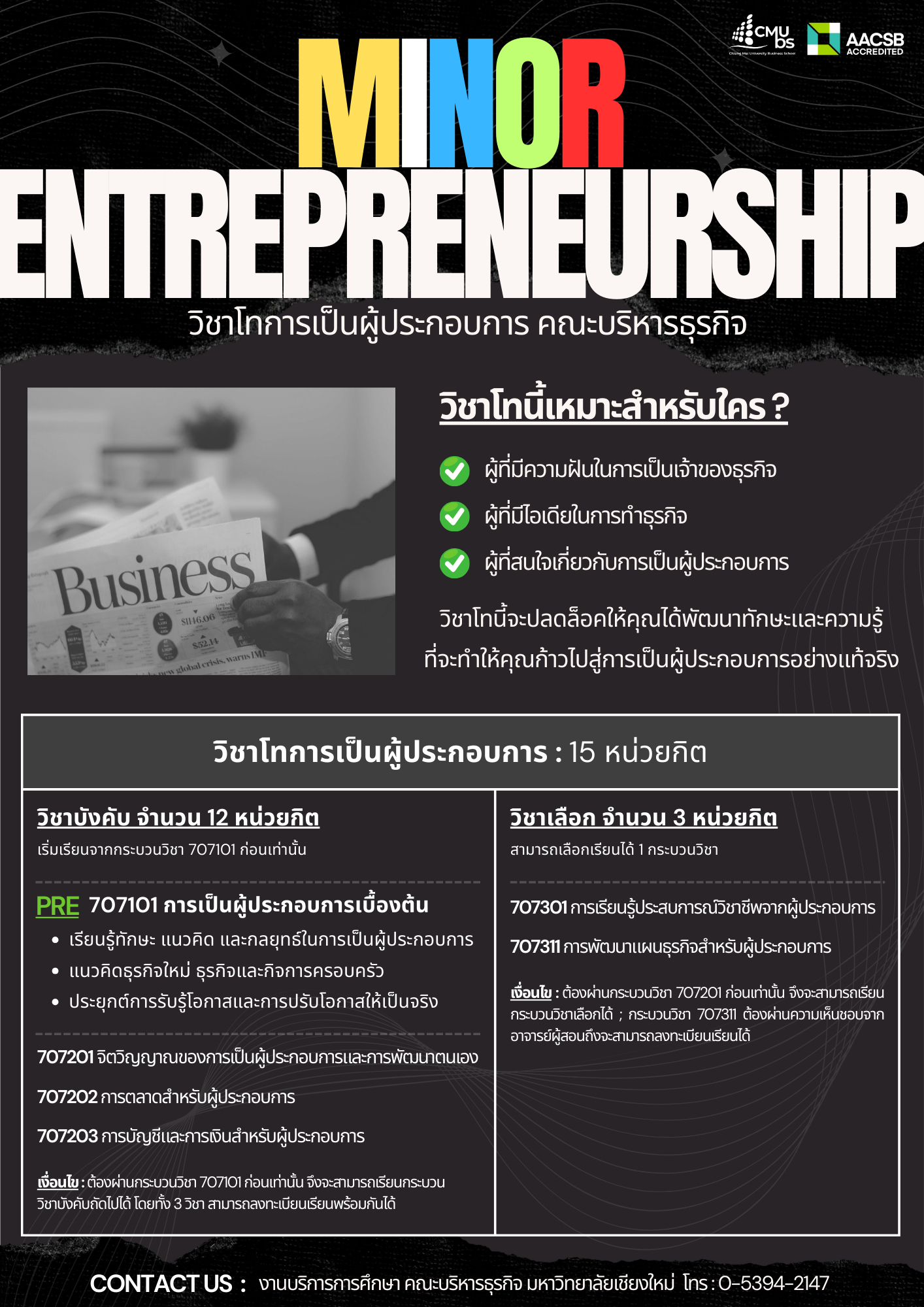 สำหรับผู้ที่มีความฝันอยากเป็น “ผู้ประกอบการ” หรือสานต่อกิจการครอบครัวในอนาคต คณะบริหารธุรกิจ มหาวิทยาลัยเชียงใหม่ (CMUBS) เปิดโอกาสให้นักศึกษาทุกคณะได้เข้าร่วมเรียนรู้ผ่าน Minor Entrepreneurship (วิชาโทการเป็นผู้ประกอบการ) ที่มุ่งเน้นการสร้างทักษะและประสบการณ์จริงด้านการทำธุรกิจ