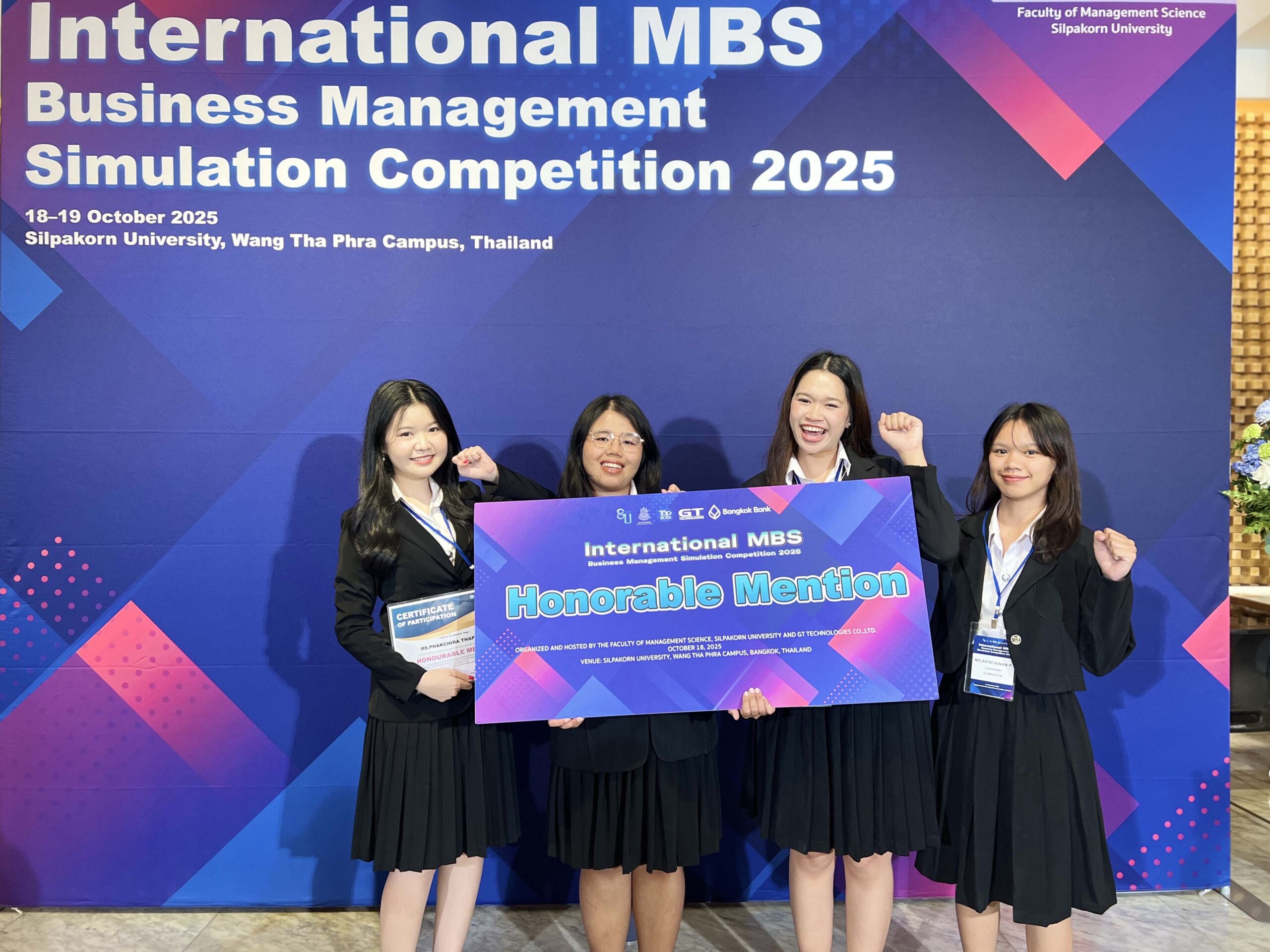 คณะบริหารธุรกิจ มหาวิทยาลัยเชียงใหม่ (CMUBS) ขอแสดงความยินดีกับทีมนักศึกษาคณะบริหารธุรกิจ ที่คว้ารางวัลรองชนะเลิศอันดับ 2 และรางวัลชมเชย จากการแข่งขัน “International MBS Business Management Simulation Competition 2025” ซึ่งจัดขึ้นเมื่อวันที่ 18 ตุลาคม 2568 โดยคณะวิทยาการจัดการ มหาวิทยาลัยศิลปากร ร่วมกับบริษัท จีที เทคโนโลยี จำกัด (GT Technology) และธนาคารกรุงเทพ จำกัด (มหาชน) จัดขึ้น ณ หอประชุมมหาวิทยาลัยศิลปากร วังท่าพระ กรุงเทพมหานคร