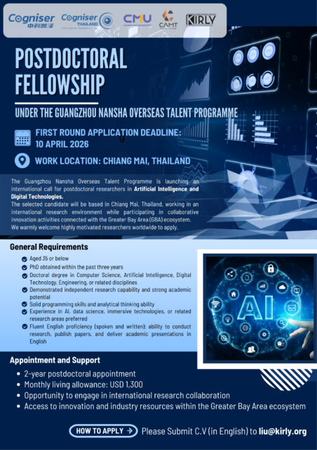 วิทยาลัยศิลปะ สื่อ และเทคโนโลยี ดำเนินโครงการ Guangzhou Nansha Overseas Talent Programme โดยมีวัตถุประสงค์เพื่อส่งเสริมความร่วมมือการวิจัยในระดับนานาชาติและสนับสนุนการพัฒนานวัตกรรมที่เชื่อมโยงกับระบบนิเวศเศรษฐกิจในเขต Greater Bay Area (GBA) และโครงการเปิดรับสมัครนักวิจัยระดับหลังปริญญาเอก (Postdoctoral Fellowship) ด้าน Artificial Intelligence และ Digital Technologies โดยผู้ที่ได้รับการคัดเลือกจะปฏิบัติงานวิจัย ณ จังหวัดเชียงใหม่ ประเทศไทย ภายใต้สภาพแวดล้อมการวิจัยระดับนานาชาติ พร้อมทั้งมีโอกาสเข้าร่วมกิจกรรมความร่วมมือด้านนวัตกรรมกับเครือข่ายต่างประเทศ รับสมัครถึงวันที่ 10 เมษายน 2569