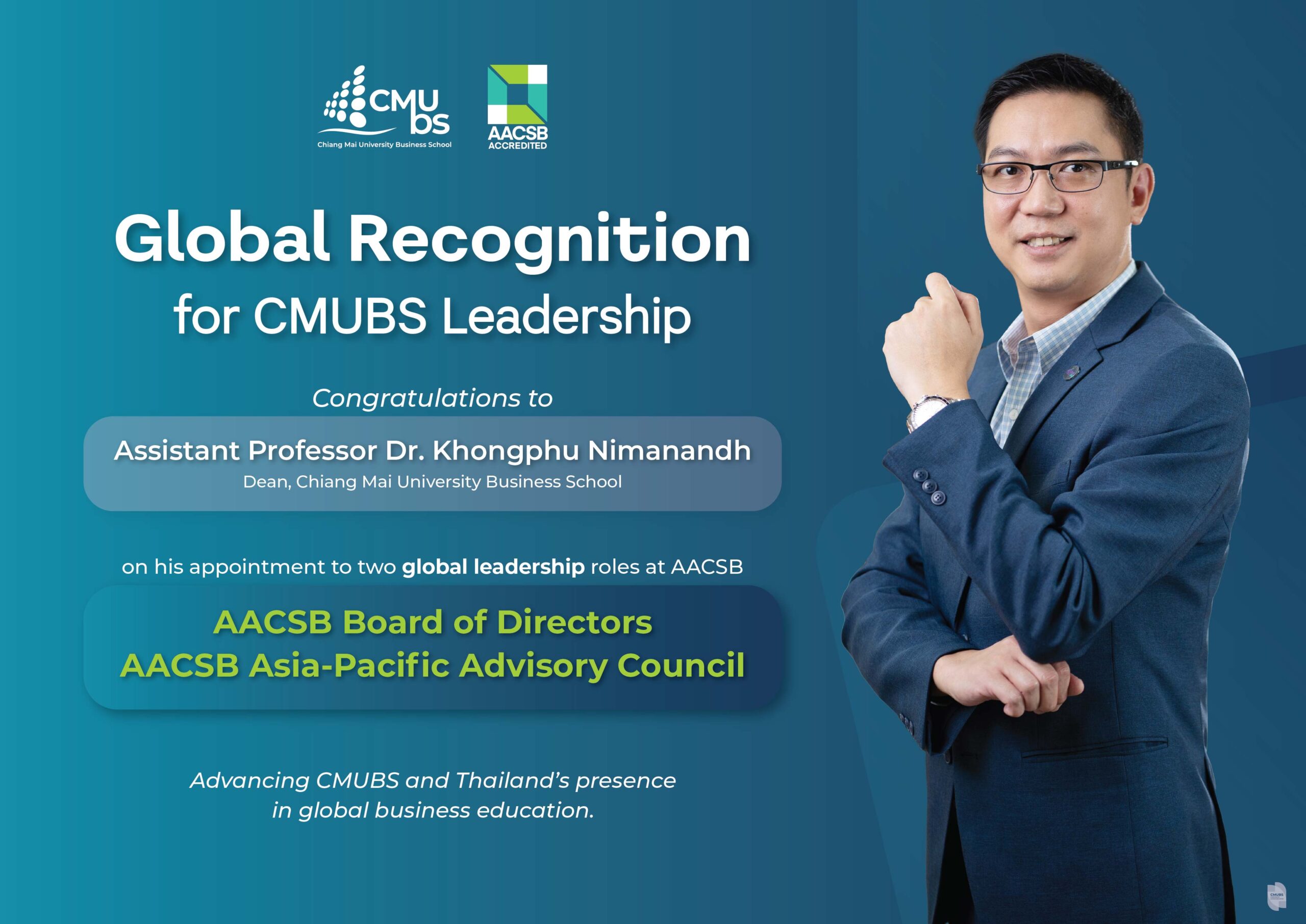 Chiang Mai University Business School (CMUBS) proudly congratulates Assistant Professor Dr. Khongphu Nimanandh, Dean of CMUBS, on his appointment to two important leadership roles within the Association to Advance Collegiate Schools of Business (AACSB), a leading global organization dedicated to advancing quality in business education. He has been appointed to serve on both the AACSB Board of Directors and the AACSB Asia-Pacific Advisory Council.
