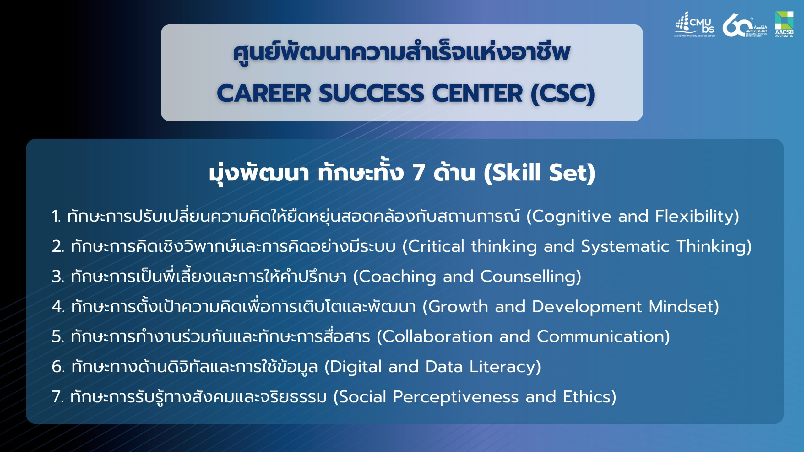 ศูนย์พัฒนาความสำเร็จแห่งอาชีพนี้กำเนิดขึ้นเพื่อเป็นสื่อกลางของความสัมพันธ์ตลอดชีวิตระหว่างนักศึกษาและศิษย์เก่ากับคณะบริหารธุรกิจ โดยมุ่งหวังให้ศูนย์นี้เป็นแหล่งปลูกฝัง พัฒนาและส่งเสริมความรู้ ทักษะ ทัศนคติตลอดจนจิตสำนึกที่จะเป็นหลักประกันให้นักศึกษาและศิษย์เก่าเป็นบุคคลที่สมบูรณ์ ประสบความสำเร็จในชีวิตอย่างมีความสุขรอบด้าน