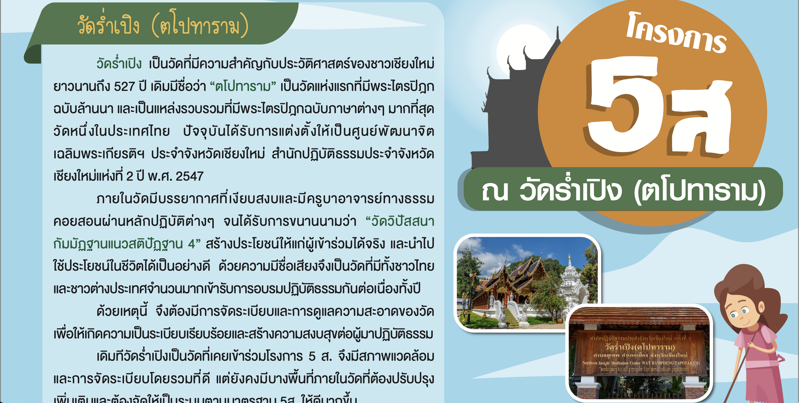 วัดร่ำเปิง เป็นวัดที่มีความสำคัญทางประวัติศาสตร์ของชาวเชียงใหทม่ เป็นแหล่งรวมพระไตรปิฎกฉบับภาษาต่างๆ ปัจจุบันเป็นศูนย์พัมนาจิตเฉลิมพระเกียรติฯ ประจำจังหวัดเชียงใหม่ และมีพุทธศาสนิกชนมาปฏิบัติธรรมเป็นจำนวนมาก ด้วยเหตุนี้จึงต้องมีการจัดระเบียบและการดูแลความสะอาดภายในวัด ทางกลุ่มนักศึกษาเข้าไปเพื่อจัดการความเรียบร้อยโดยการใช้หลัก 5ส. ในการจัดการระเบียบภายในวัดให้ดียิ่งขึ้น
